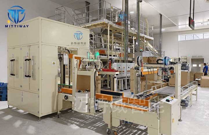 迈特威探测器折盒包装线为安防产品提供了一套涵盖折盒,盒盖,堆叠,装箱,封箱,捆扎功能的纸盒包装线。