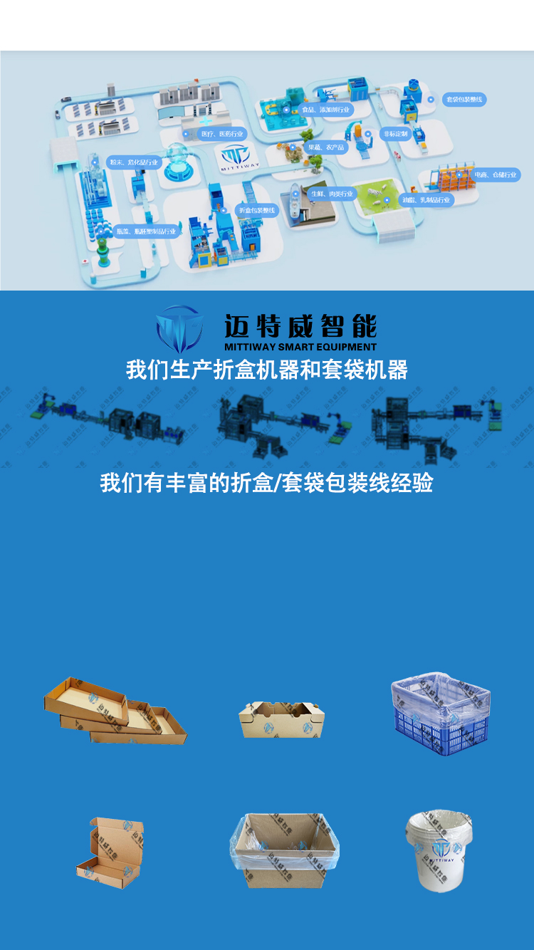 迈特威智能自主研发纸箱套袋机、桶套袋机、周转筐套袋机、家电套袋机、酒盒套袋机等,以及油脂后端套袋包装解决方案。