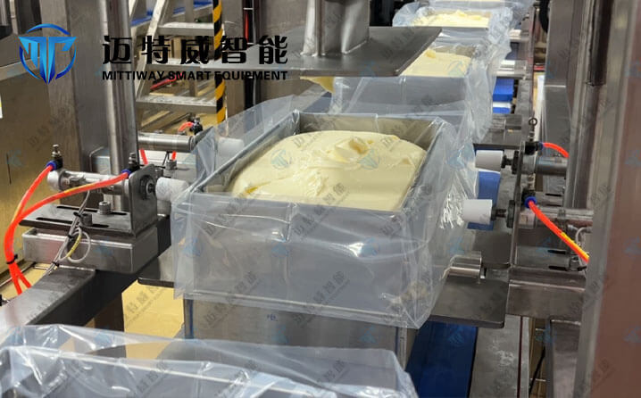 迈特威黄油后道包装解决方案提供从开箱-套袋-灌装-提袋封口-称重-金属检测-封箱-码垛等一站式服务,整线引入自动化包装线,通过智能包装设备完成黄油产品装箱、封箱、码垛等后道包装流程,能够连续、稳定地进行黄油的包装作业,各环节均实现自动化控制,大幅减少人工操作,提高生产效率。