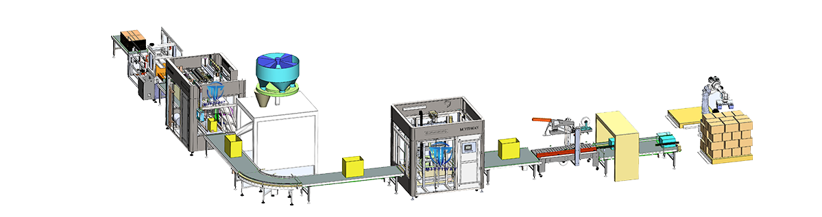 医药盖子后道包装解决方案是迈特威智能设备(广东)有限公司倾力打造标准化、高效化、安全化的后段包装全自动解决方案,提供从开箱-套袋-灌装-称重-金属检测-提袋封口-封箱-码垛等一站式服务。